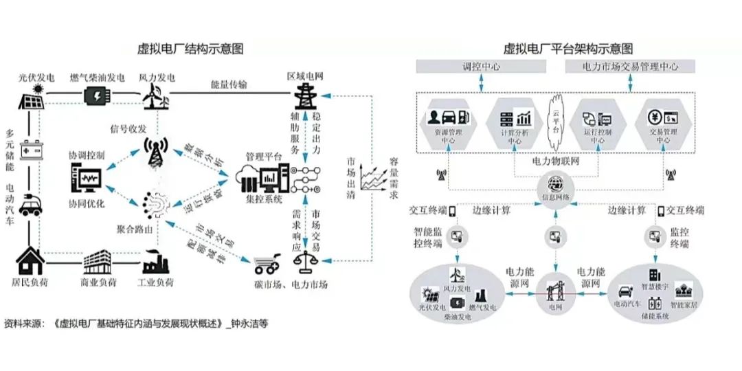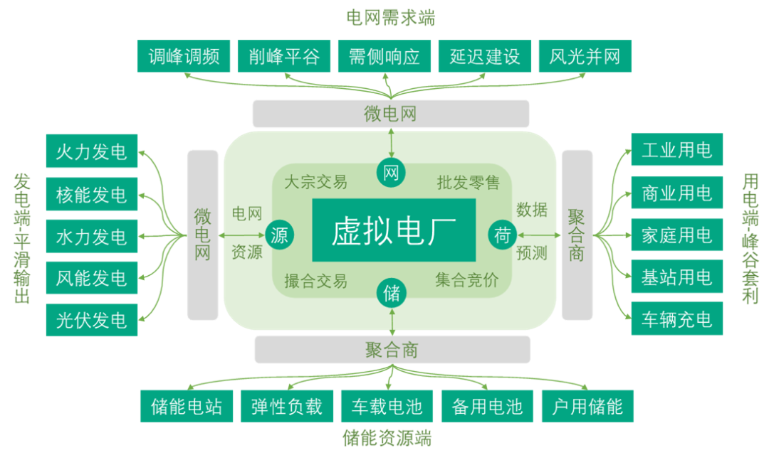 虚拟电厂(VPP, Virtual Power Plant)是一种新型电源协调管理系统,通过信息技术和软件系统,实现分布式电源、储能、可调负荷等多种分布式资源的聚合和协同优化。作为一个特殊的电厂,它既可以作为“正电厂”向系统供电调峰,又可作为“负电厂”加大负荷消纳配合系统填谷。可以说,虚拟电厂是一种电力能源新生态。