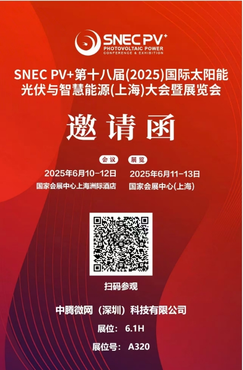中腾微网诚挚邀请您莅临 SNEC PV+第十八届(2025)国际太阳能光伏与智慧能源大会暨展览会(2025年6月1日-6月3日),参观我司展位。